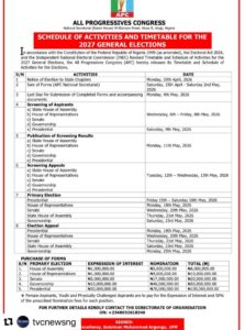 Politics APC releases timetable for 2027 elections, outlines primary election schedule Read More » April 21, 2026 No Comments